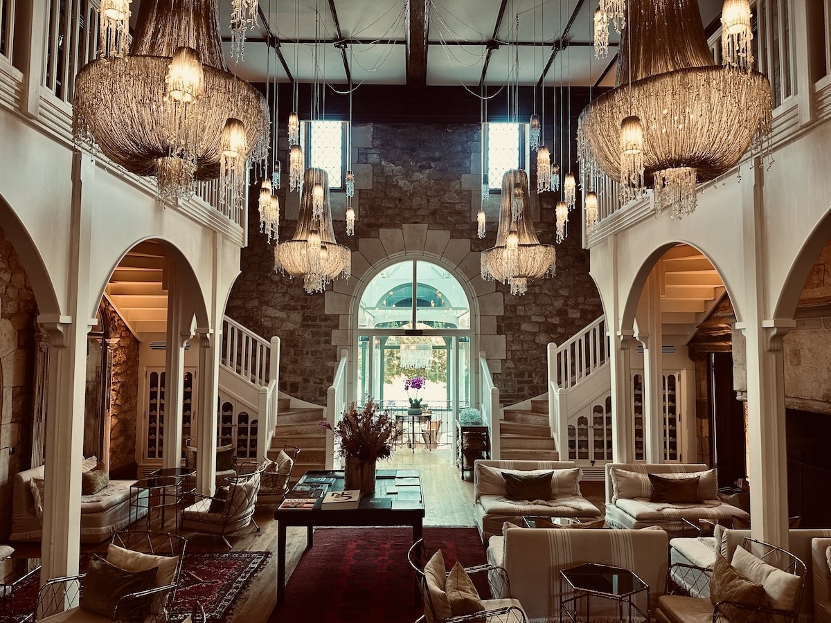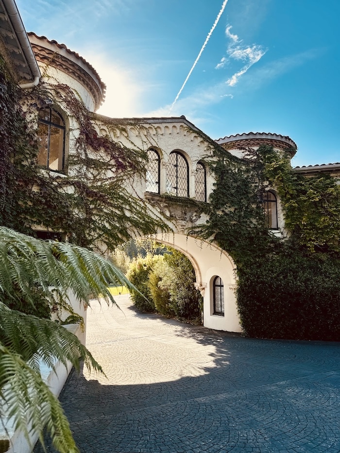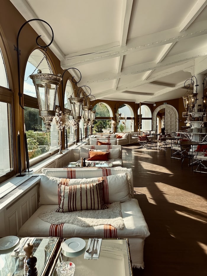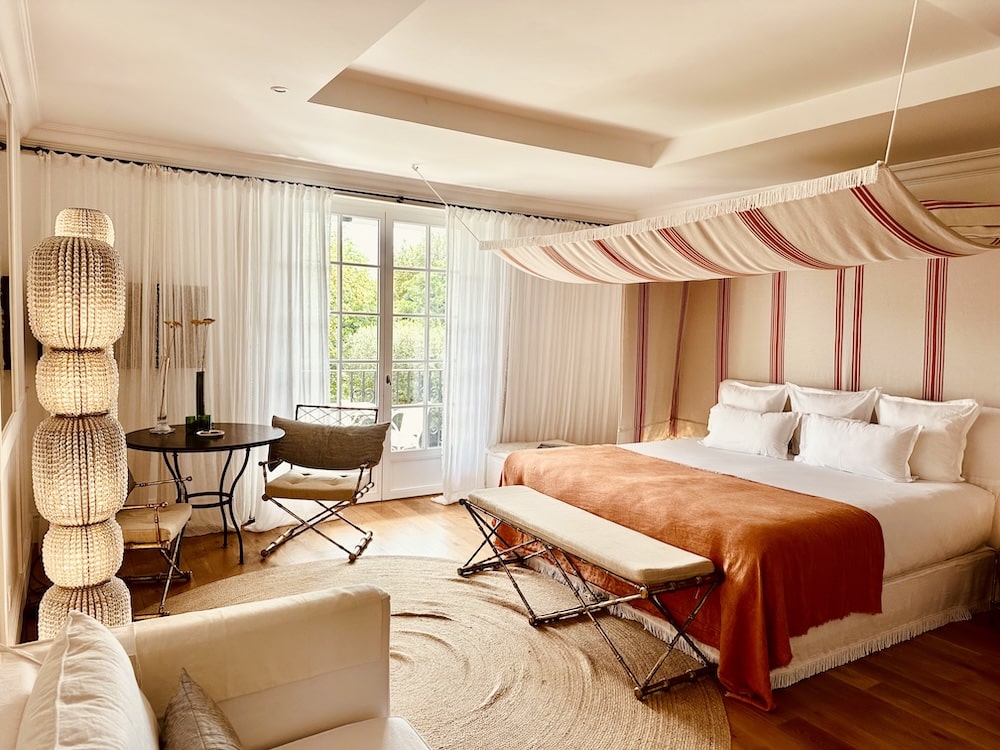 Each space feels personal, like a room in a beloved family home. Light streams in from the lake-facing windows, illuminating mirrors sourced from Spanish flea markets and lamps shaped like long coral. The atmosphere recalls the château’s glamorous past, yet it feels distinctly modern and comfortable — luxurious without ostentation.