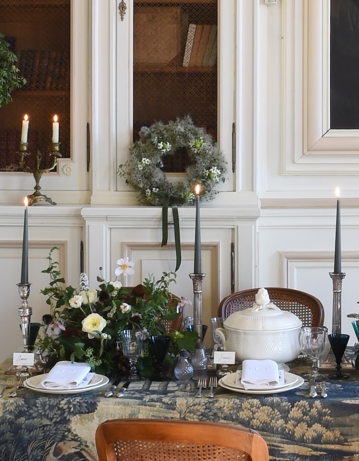 The foundation of any well-decorated table is a beautiful tablecloth. To give your holiday table some coveted French flair, choose tablecloths, runners and napkins in soft, neutral colors like ivory or taupe, faded colors like blue, paired with gold and copper accessories for a moody look. Alternatively, Christmas colors and natural imagery are never amiss, timeless in their appeal and exuding seasonal joy.