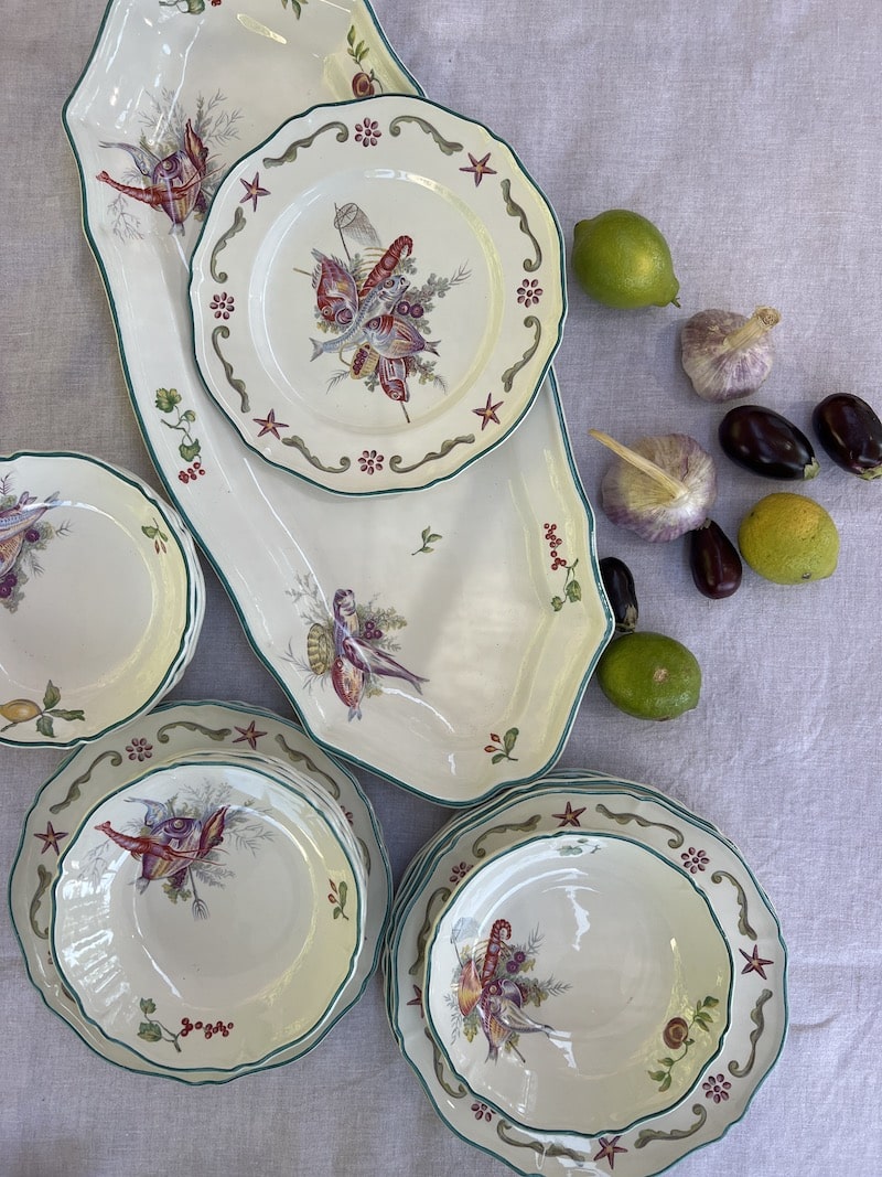 A Provençal placemat instantly evokes an unhurried afternoon in the south of France. Set against a plain linen tablecloth, with antique dinnerware and a bunch of lavender, the effect is transporting.