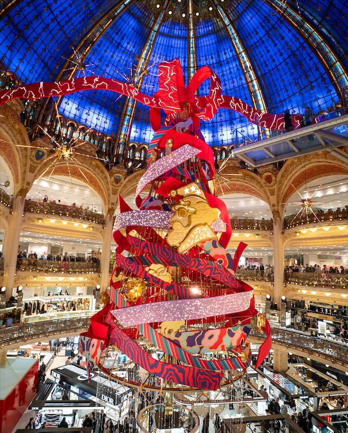 At Galeries Lafayette, the historic building’s grand central dome is an unbeatable space for a grand Christmas tree. This year Jeanne Detallante, a talented illustrator who has worked with a number of couture brands, was entrusted with the design of both the windows and the central display. The artist took inspiration from the department store’s archives to imagine a Christmas story that pays tribute to the Galerie’s creative heritage.