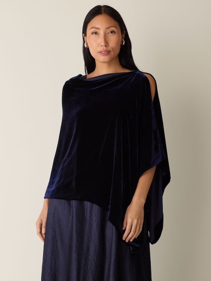 Make a stunning statement with a full, long velvet dress paired with sparkling accessories. You can also top your look with a velvet poncho to give an air of elegant mystère.