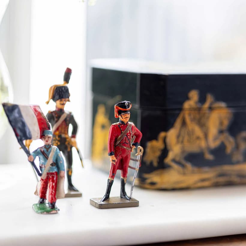 For modern interiors, these elements should be distilled rather than replicated full-scale. A gilt-framed mirror above a mantel, a bronze bust on a bookshelf, or a marble-topped side table all nod to history without overwhelming a space. Even playful touches, like vintage Napoleonic toy soldiers, recall 19th-century salons and add character to bookshelves or side tables.